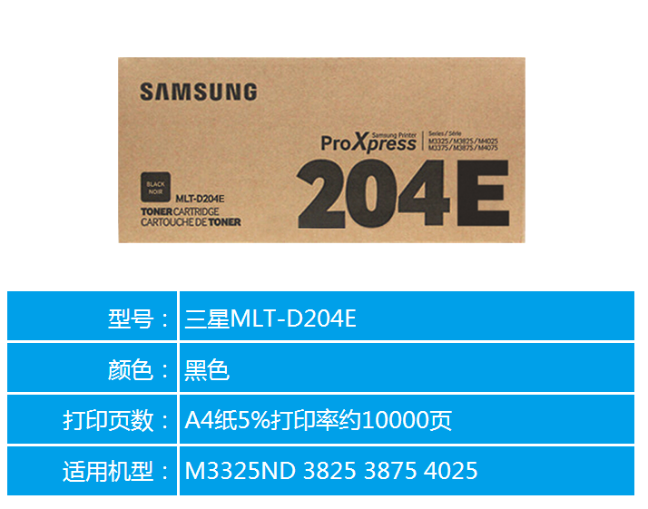 • 商品名称:三星原装MLT-D204S粉盒204硒鼓适用于 M3325ND 3825 3875 4025 MTL D204E超大容量粉盒(约10000页)