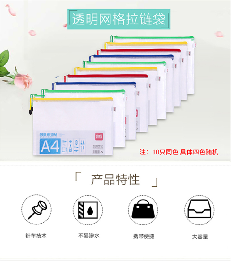 • 商品名称:得力(deli)10只A4透明网格拉链袋 资料文件袋 5654 单只装