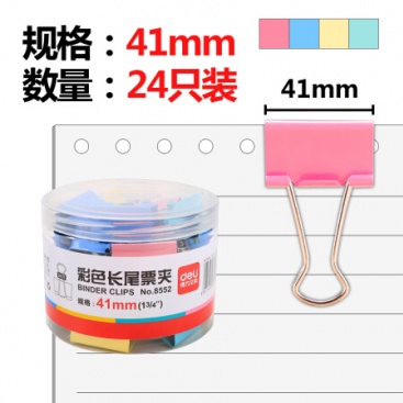 • 商品名称:得力(deli)24只41mm彩色长尾票夹 金属票据夹燕尾夹铁夹子 大号8552