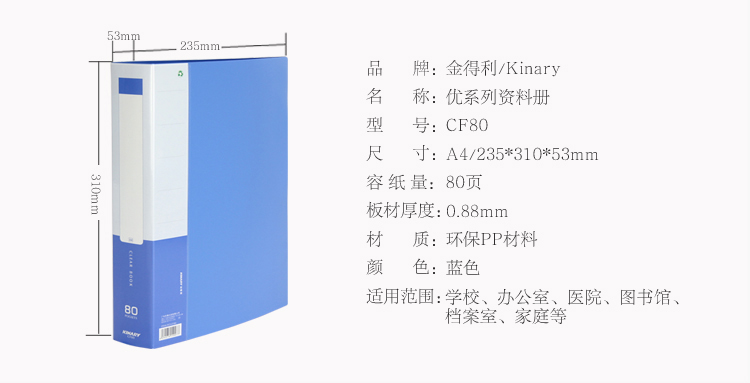 • 商品名称:金得利(KINARY) CF80 资料册文件册80页A4 蓝色