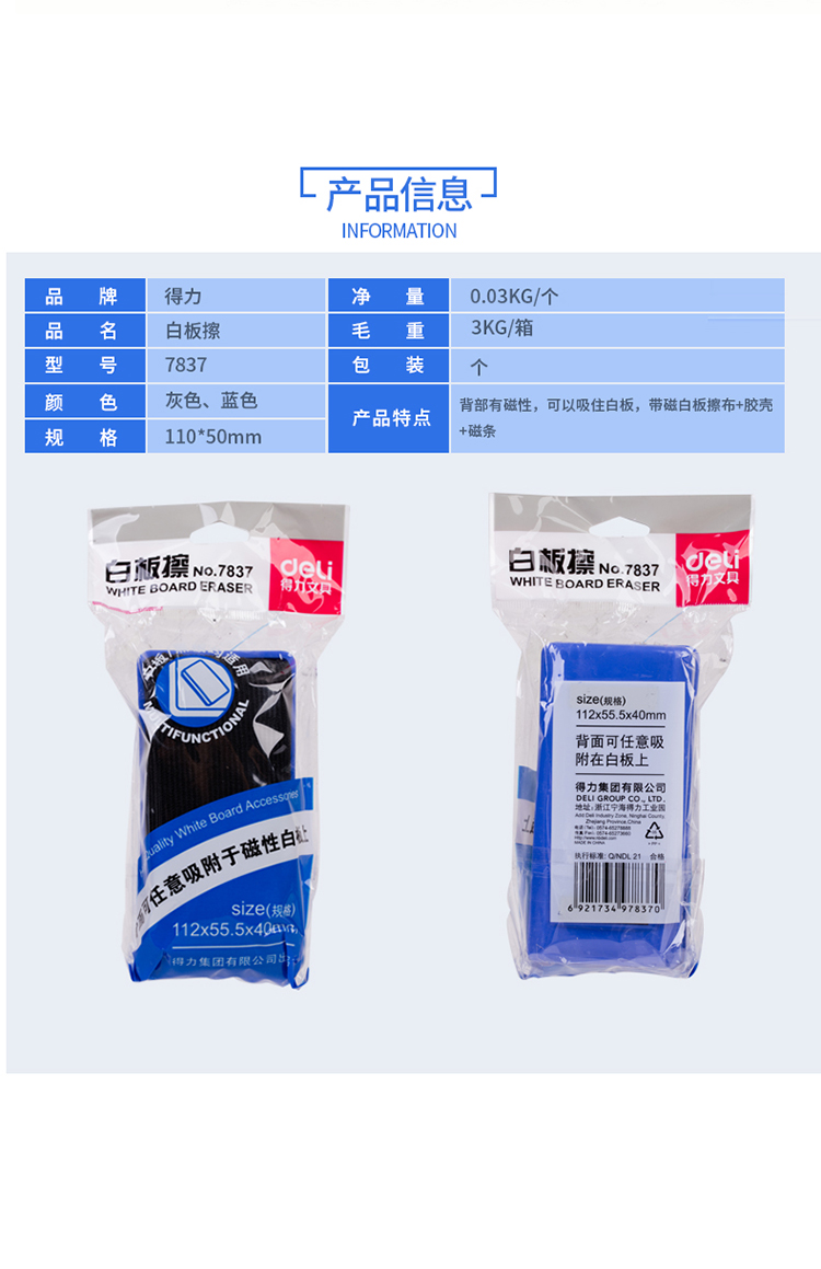 • 商品名称:得力(deli) 112*55*40mm白板磁性白板擦背面吸附黑板擦 颜色随机7837