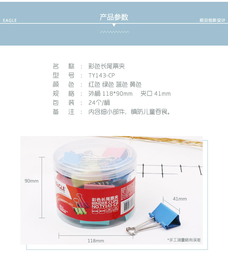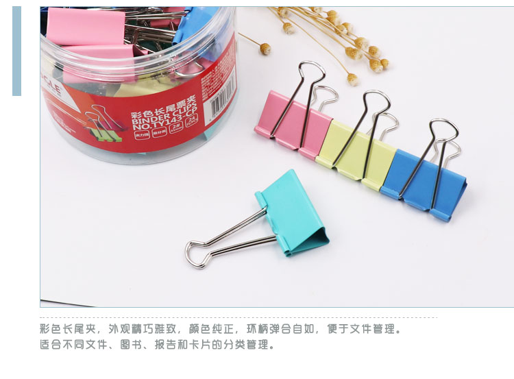 • 商品名称:益而高(EAGLE)24只装41mm彩色长尾夹 中号燕尾夹子金属文件夹票据夹办公文具 1桶装 TY143-CP