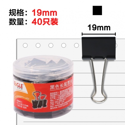 • 商品名称:益而高(EAGLE)40只装19mm黑色长尾夹 小号燕尾夹子金属文件夹票据夹办公文具 1桶装 TY145-P