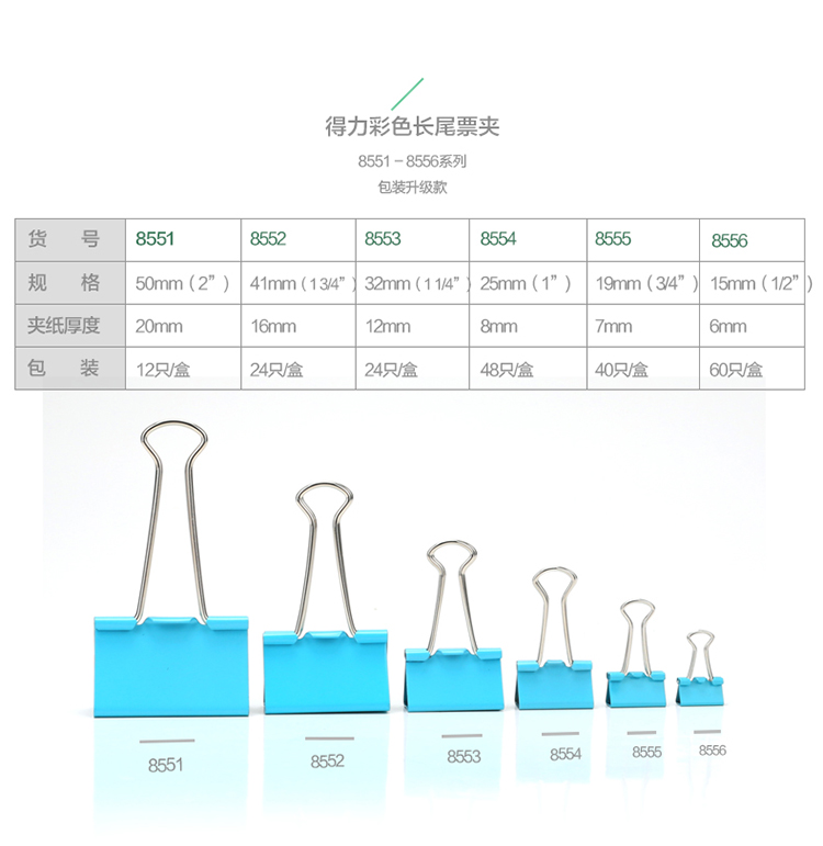 • 商品名称:得力(deli)48只25mm彩色长尾票夹 金属票据夹燕尾夹铁夹子 中号8554