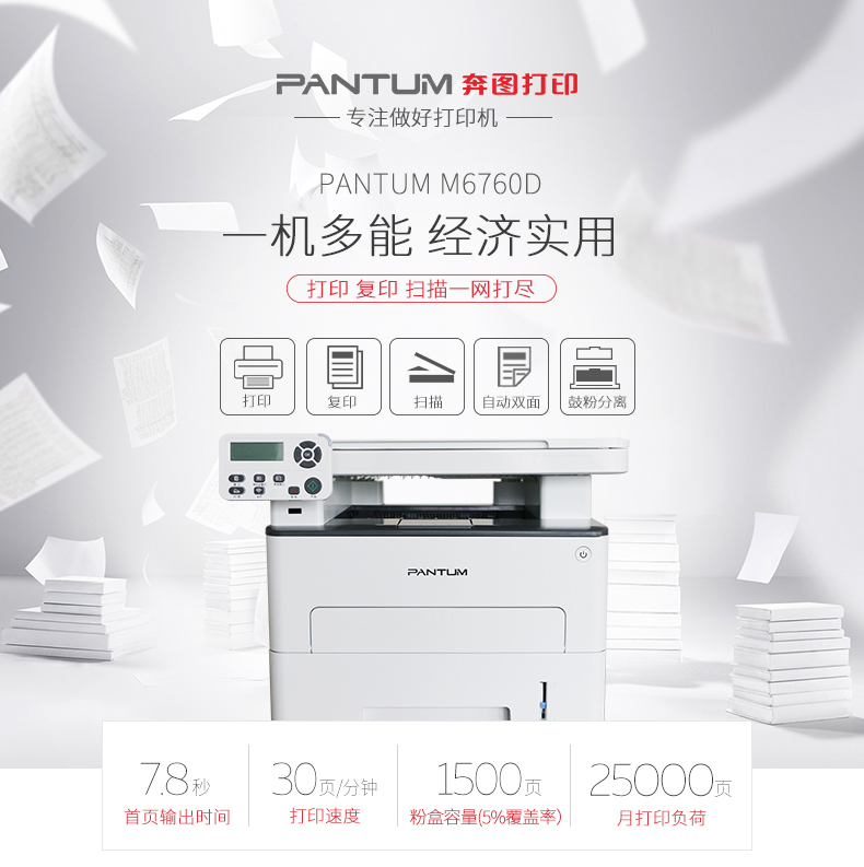 • 商品名称: 奔图(PANTUM)M6760D 黑白激光多功能一体机(打印、复印、扫描、自动双面)