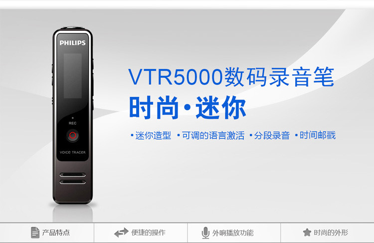 • 商品名称:飞利浦(PHILIPS)VTR5000 4GB 学习记录 时尚小巧 数字降噪录音笔
