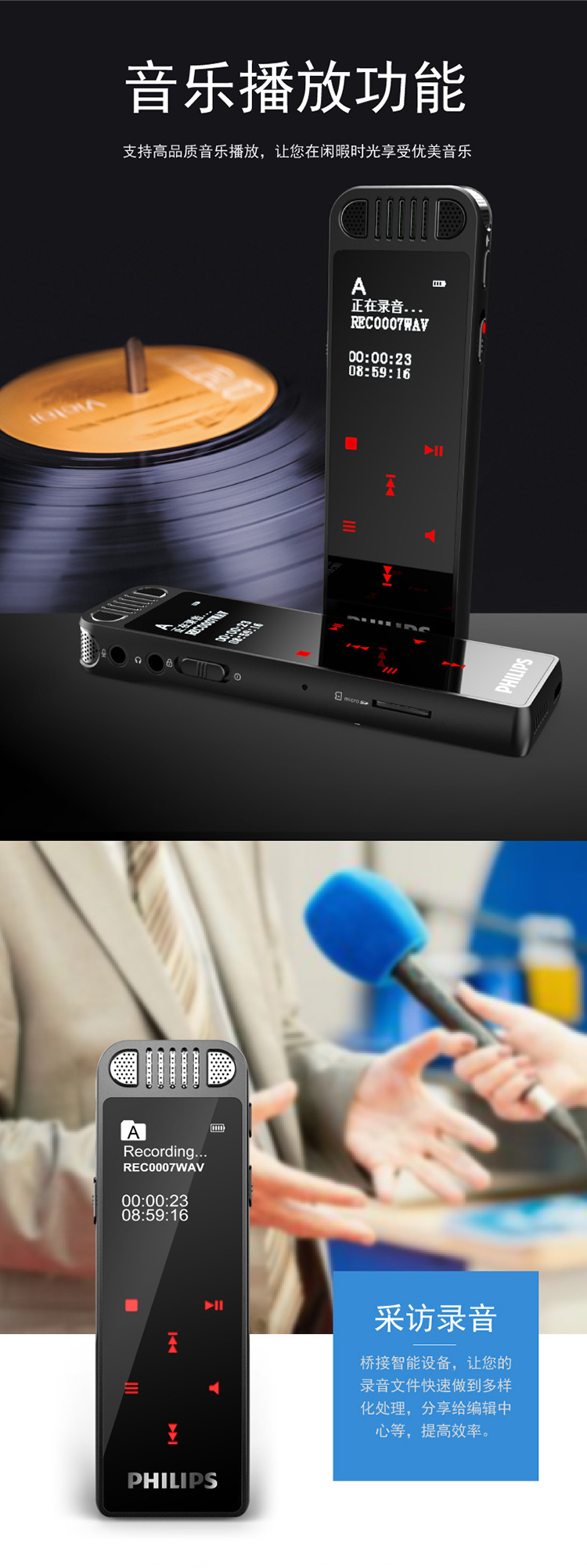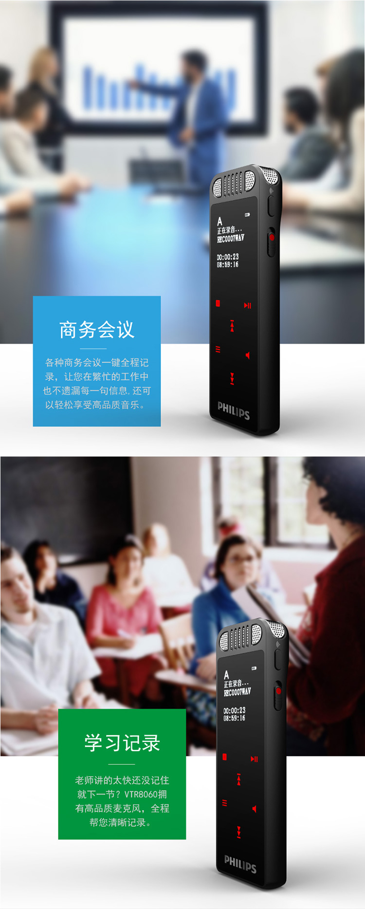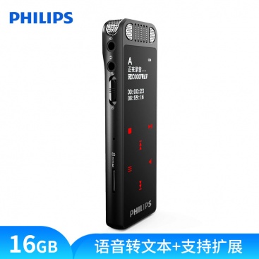 • 商品名称:飞利浦(PHILIPS)VTR8060 16GB 会议 学习记录 WIFI 语音转文本 APP文件传输分享 智能数字降噪录音笔 黑色