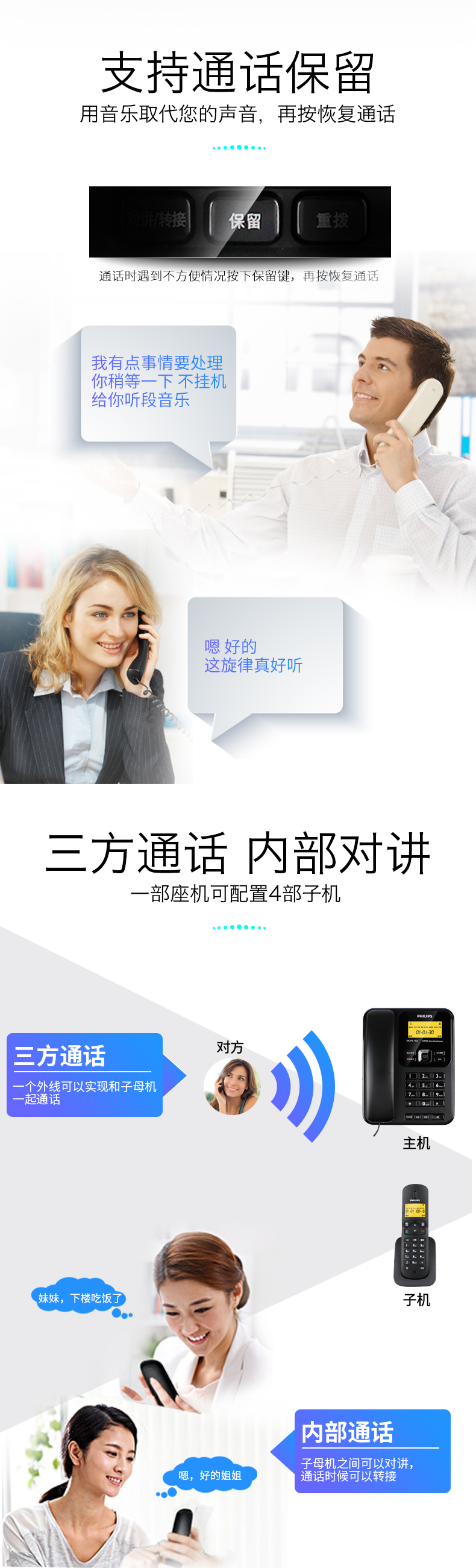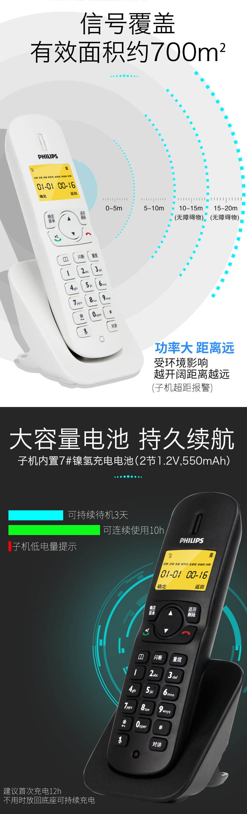 • 商品名称:飞利浦(PHILIPS)无绳电话机 无线座机 子母机 办公家用 可扩展子机 中文菜单 双免提 DCTG182黑色一拖一
