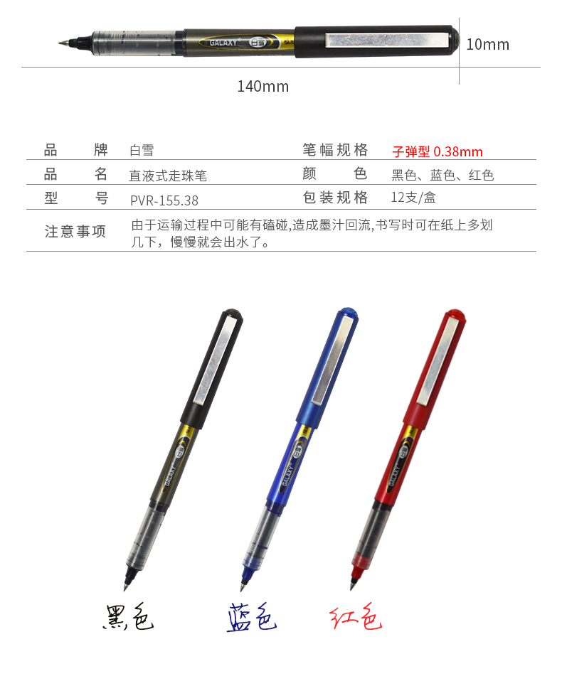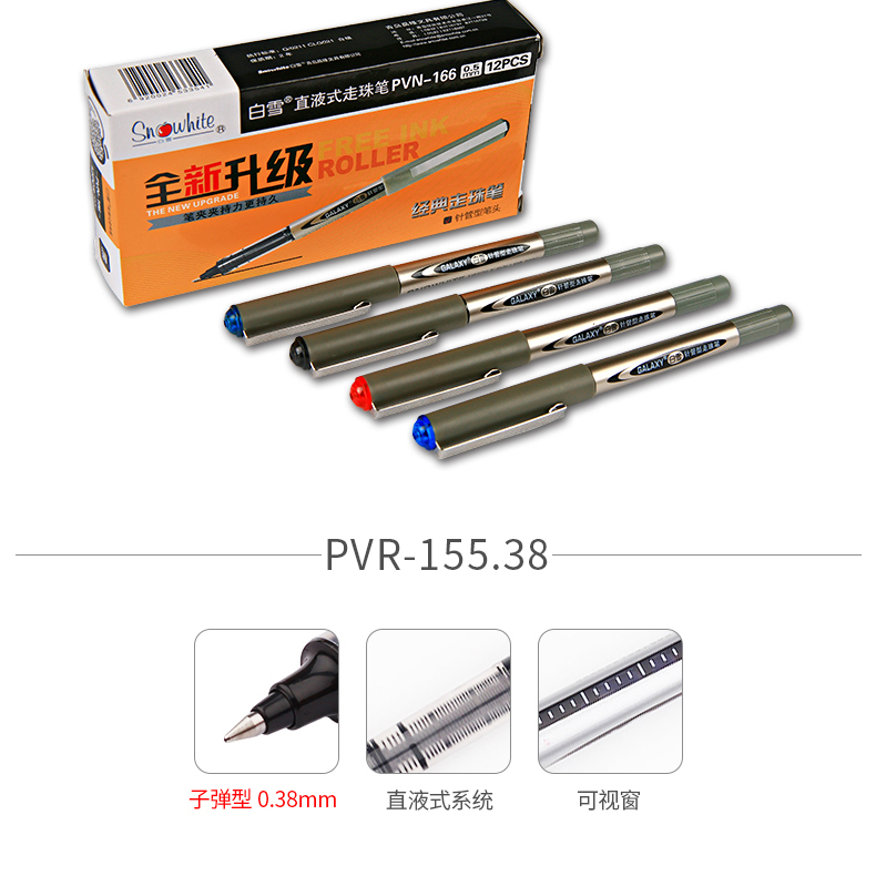 • 商品名称:白雪(snowhite)品质直液式走珠笔子弹型0.5mm学生用中性笔签字笔考试专用笔巨能写PVR-155黑色 12支/盒