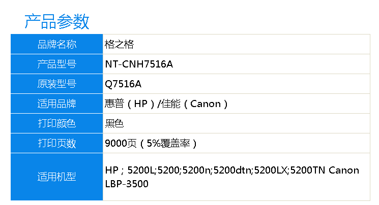 • 商品名称:格之格Q7516A硒鼓NT-CNH7516A适用惠普hp5200 5200n 5200LX 5200TN打印机耗材佳能LBP3500粉盒HP16A硒鼓