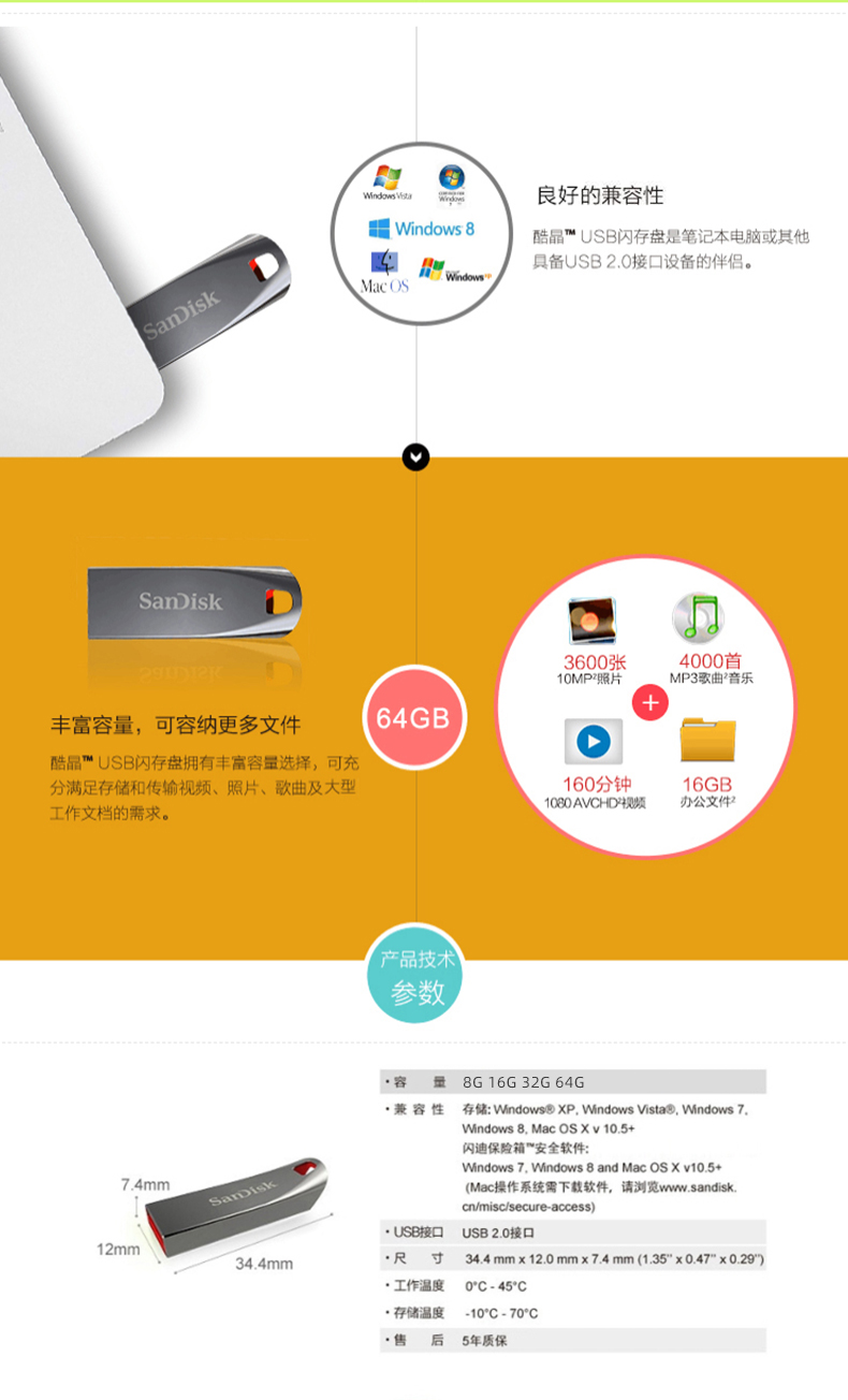 • 商品名称:闪迪(SanDisk)16GB USB2.0 U盘 CZ71酷晶 银灰色 全金属外壳