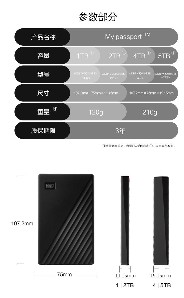 • 商品名称:西部数据(WD)1TB USB3.0移动硬盘My Passport随行版 2.5英寸 黑色(密码保护 自动备份)WDBYVG0010BBK