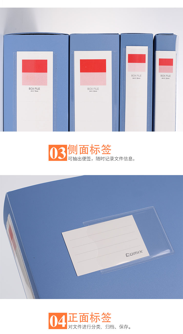 • 商品名称:齐心(Comix) 6个装 55mm加厚档案盒/A4文件盒/牢固耐用粘扣资料盒 收纳盒 A8055-6 蓝色