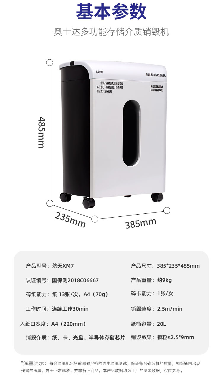 • 商品名称:奥士达(OASTAR)航天XM7 多功能碎纸机 粉碎机