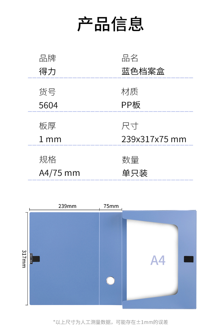 • 商品名称:得力(deli) 75mm A4粘扣档案盒 5604