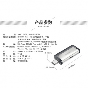 • 商品名称:闪迪(SanDisk)128GB Type-C USB3.1 手机U盘 DDC2至尊高速版 读速150MB/s Z46