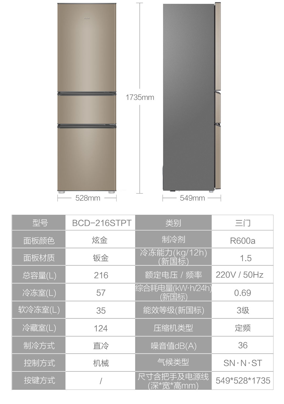 • 商品名称:海尔 (Haier)216升直冷三门三温区家用节能小冰箱制冷快BCD-216STPT