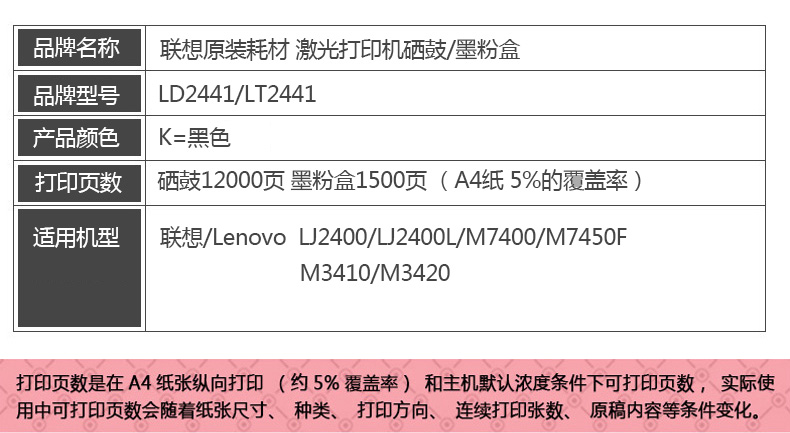 • 商品名称:联想(Lenovo)LT2441墨粉(适用LJ2400T LJ2400 M7400 M7450F打印机)