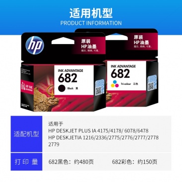 • 商品名称:惠普(hp)682墨盒2775/2776/2777/2778/2779/4175/4178/6078 682黑色彩色套装(480页+150页)