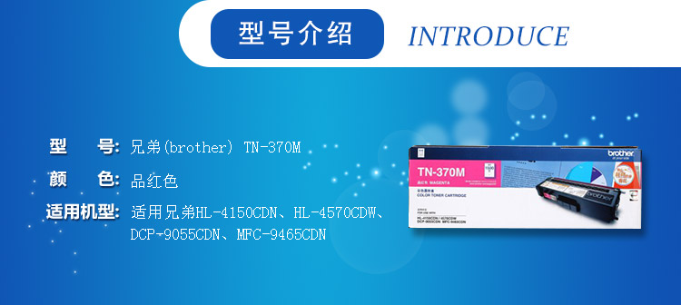 • 商品名称:兄弟(brother) TN-370M 品红色粉仓(适用HL-4150CDN/HL-4570CDW/DCP-9055CDN/MFC-9465CDN)