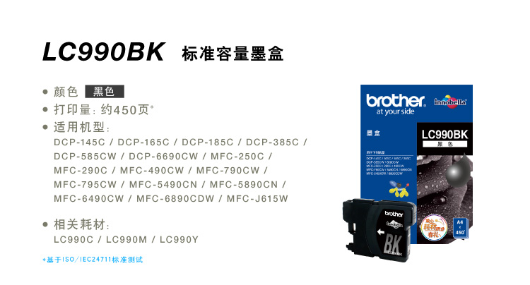 • 商品名称:兄弟(brother) LC990BK 黑色墨盒(适用DCP-145C/165C/385C/MFC-250C/290C/490CW/790CW/5490CN)