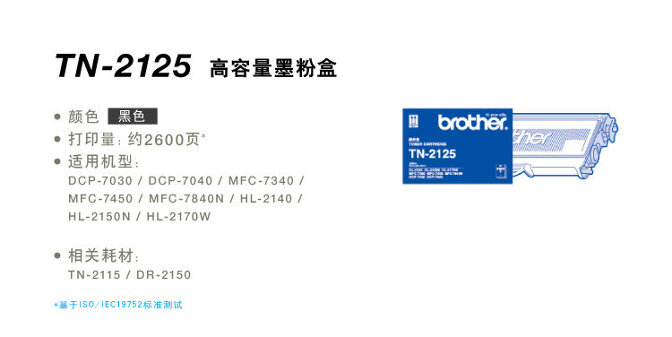 • 商品名称:兄弟(brother) TN-2125 黑色高容墨粉仓 (适用HL2140 2150N DCP7030,MFC7450/7340)