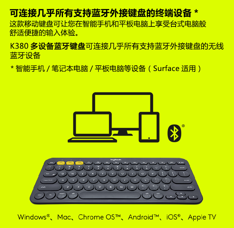 • 商品名称:罗技(Logitech)K380多设备蓝牙键盘 平板IPAD键盘 时尚便携 超薄巧克力按键 蓝牙鼠标伴侣 蓝色