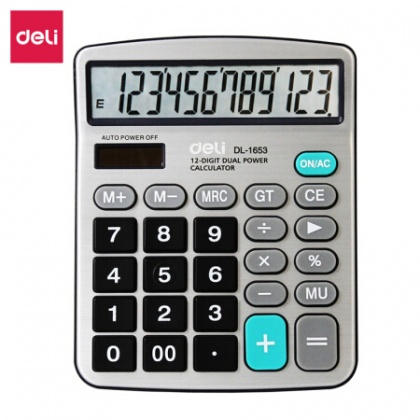 • 得力(deli)双电源宽屏办公桌面计算器 财务计算机 银白色1653