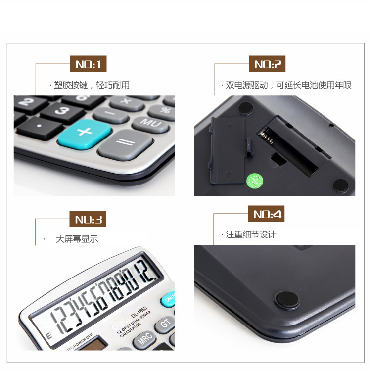 • 商品名称:得力(deli)双电源宽屏办公桌面计算器 财务计算机 银白色1653