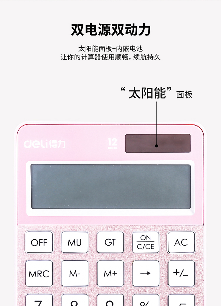 • 商品名称:得力(deli)时尚办公双电源计算器 12位大屏显示计算机 玫瑰金1576A