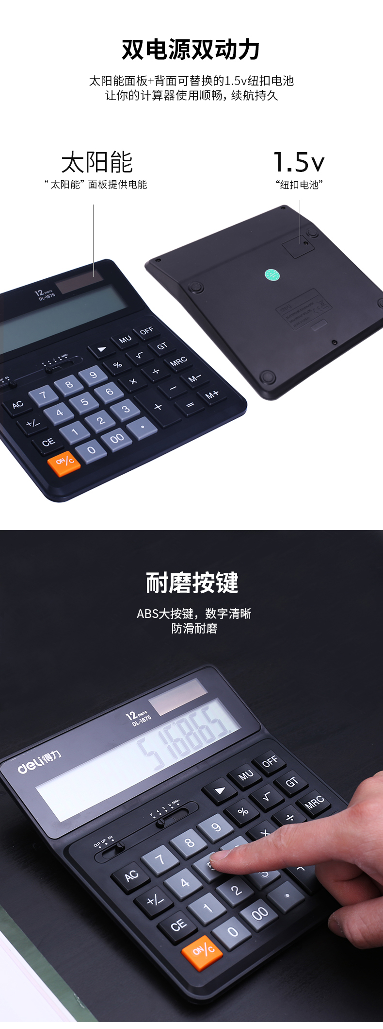 • 商品名称:得力(deli)双电源桌面计算器 12位数宽屏财务计算器 黑色1675