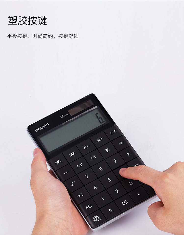 • 商品名称:得力(deli)双电源 无缝按键办公桌面计算器 黑色 1589P