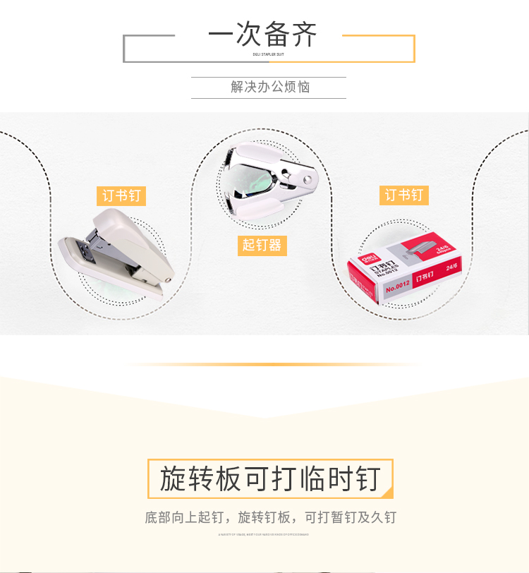 • 商品名称:得力(deli)钢制耐用办公订书机套装(订书机+起钉器+订书钉) 适配12#钉 颜色随机0359