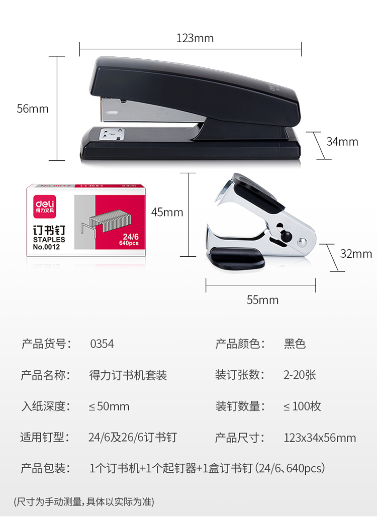 • 商品名称:得力(deli)12#办公订书机3件套(订书器+订书针+起钉器) 黑色0354