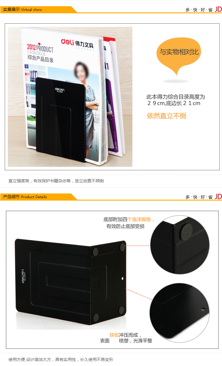 • 商品名称:得力(deli)7英寸(高17cm)金属无缝铁书立架 办公书靠2片/付 黑色9264
