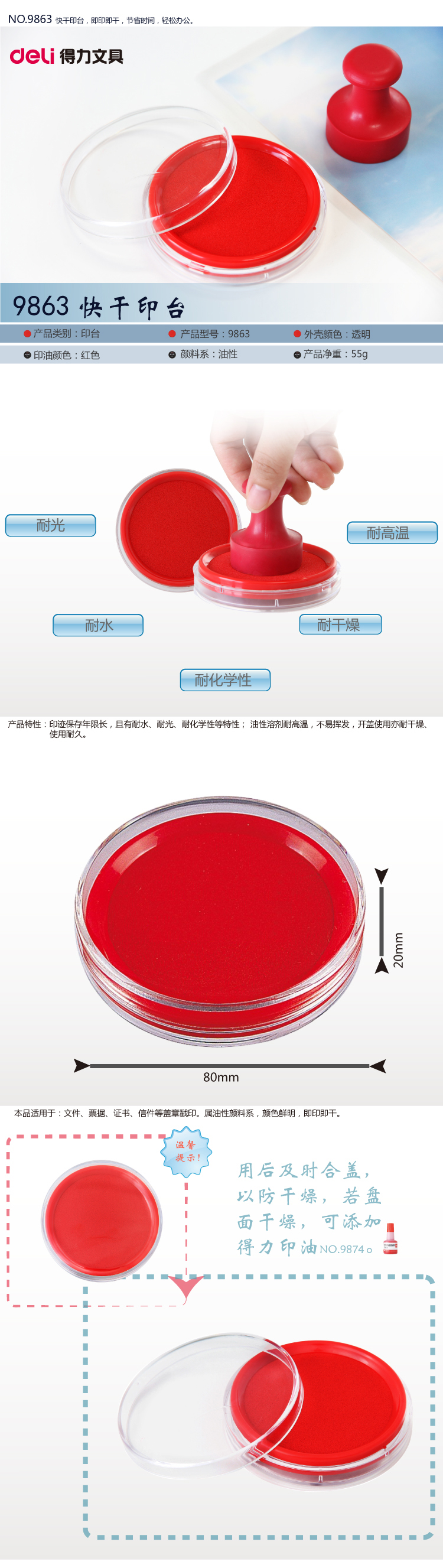 • 商品名称:得力(deli)80mm圆形快干印台印泥 红色9863