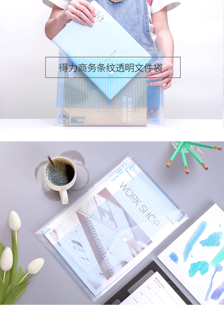 • 商品名称:得力(deli)加厚10只条纹透明按扣文件袋 A4高质感资料袋会议袋 5630