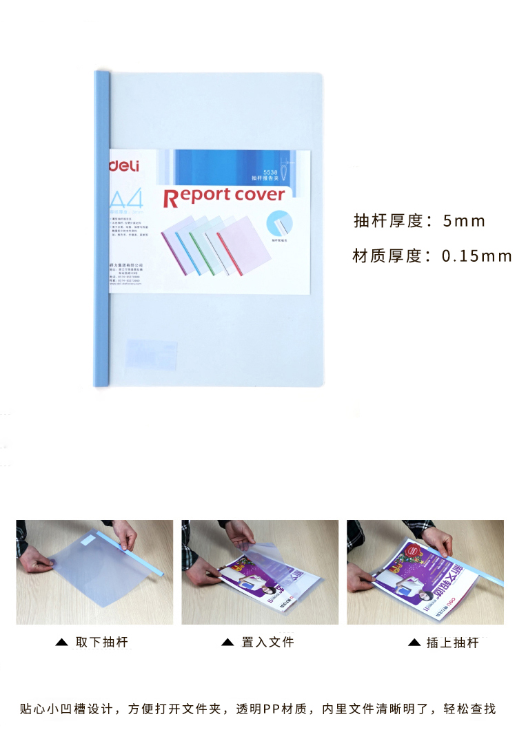 • 商品名称:得力(deli)10只A4彩色半透明抽杆文件夹报告夹拉杆夹 5色随机5538