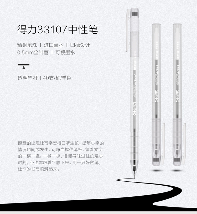 • 商品名称:得力(deli)0.5mm全针管黑色中性笔水笔签字笔 40支/桶33107