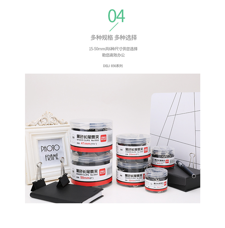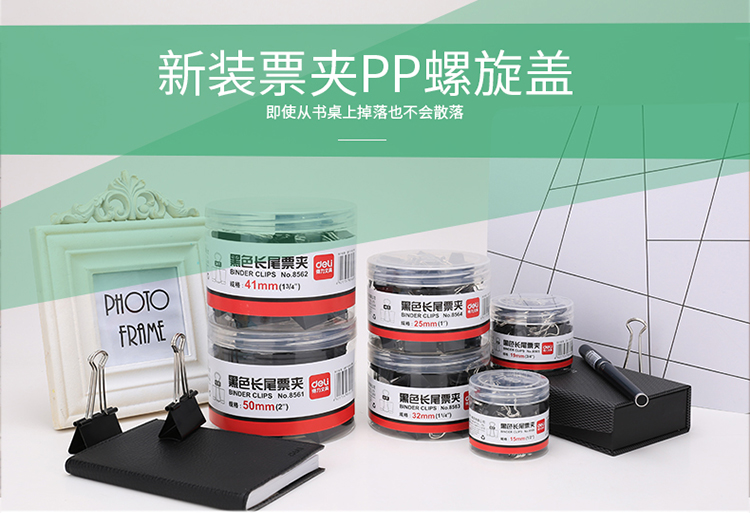 • 商品名称:得力(deli)40只19mm黑色长尾票夹 金属票据夹燕尾夹铁夹子 小号8565