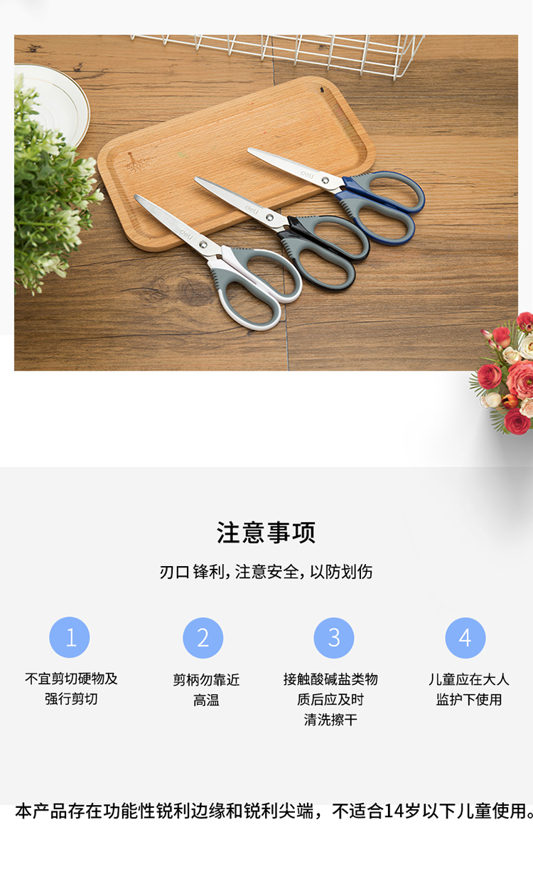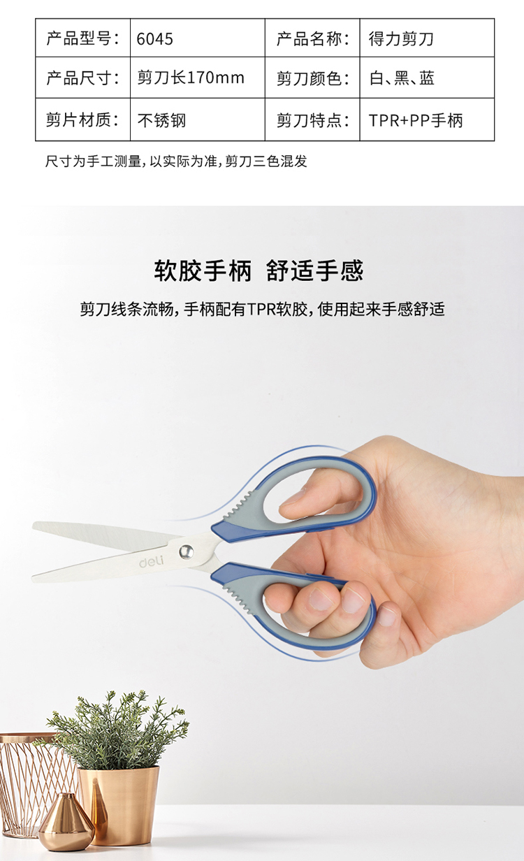• 商品名称:得力(deli)170mm中号不锈钢办公剪刀 桌面手工剪子 颜色随机6045