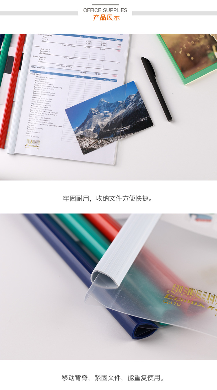 • 商品名称:齐心(Comix) 10个装 强力加厚型抽杆夹/文件夹/报告夹/拉杆夹A4 Q310 白色 办公文具