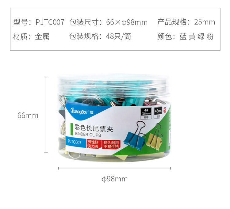 • 商品名称:广博(GuangBo)48只装25mm彩色长尾夹子燕尾夹票夹办公用品PJTC007