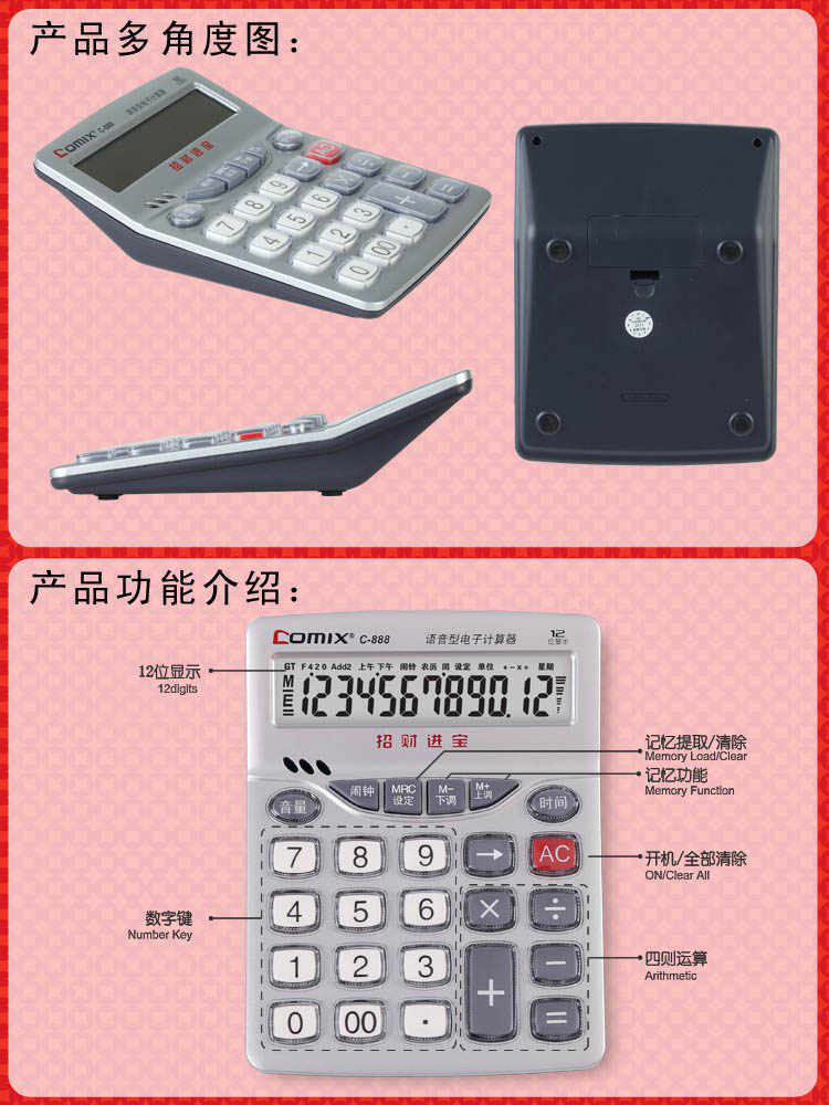 • 商品名称:齐心(COMIX)C-888 中台招财进宝语音型计算器 12位 新老包装随机发货