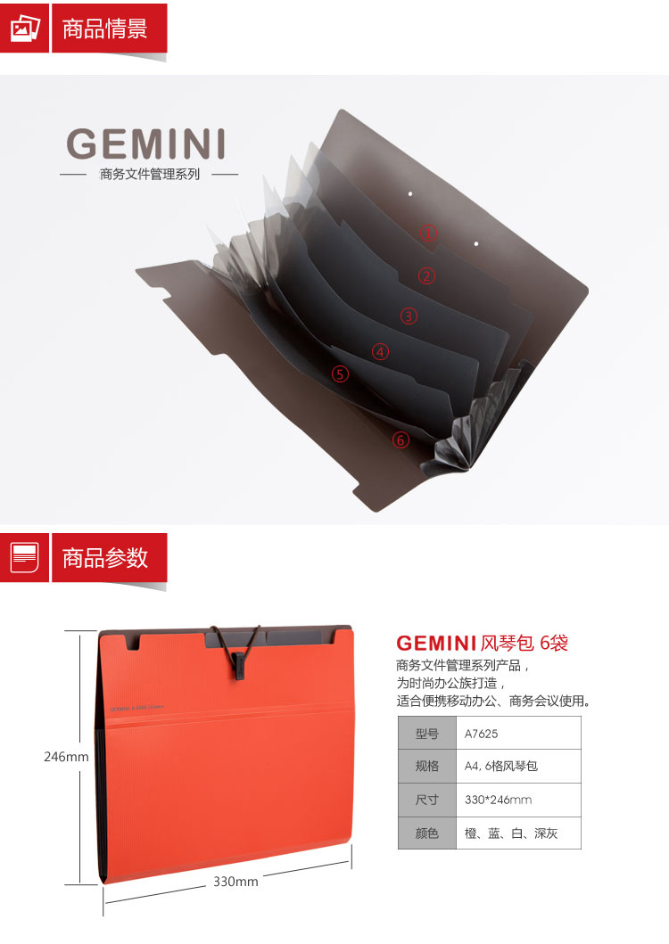 • 商品名称:齐心(Comix) A7625 A4文件包 6格风琴包 文件包 Germini系列 深灰色