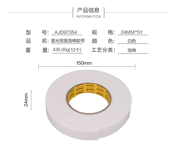 • 商品名称:晨光(M&G)24mm*5y双面泡棉胶泡沫胶带4.57m/卷 12卷装AJD97354