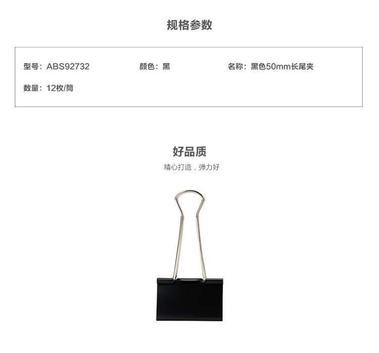 • 商品名称:晨光(M&G)Eplus系列50mm黑色长尾夹燕尾夹票据夹 12只/罐ABS92732