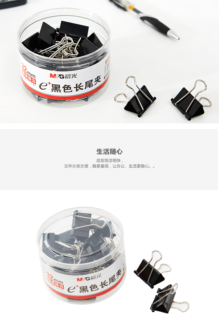 • 商品名称:晨光(M&G)Eplus系列32mm黑色长尾夹燕尾夹票据夹 24只/罐ABS92734
