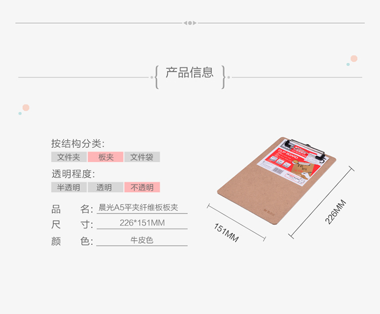 • 商品名称:晨光(M&G)A5平夹纤维板夹记事夹字板垫板文件夹 单个装ADM94878