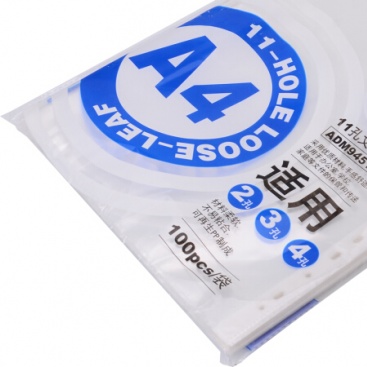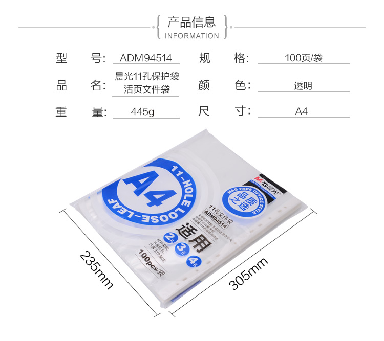 • 商品名称:晨光(M&G)A4/11孔透明资料袋活页文件替芯保护袋 100页/袋ADM94514